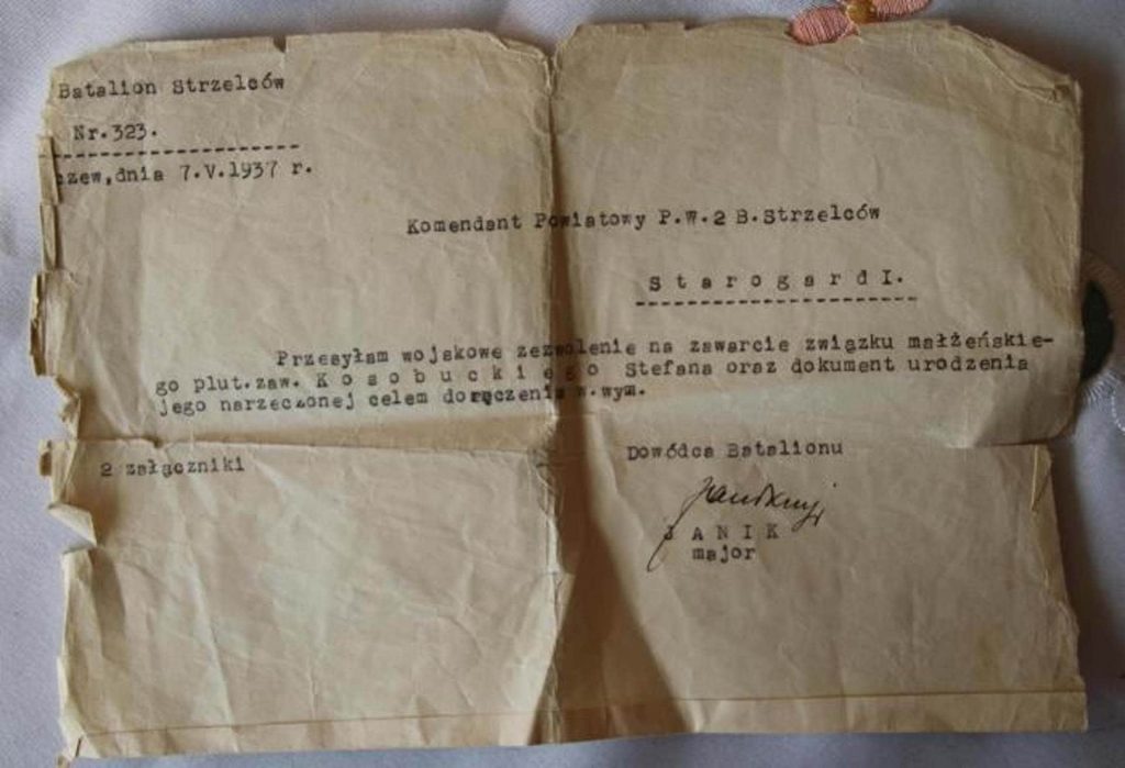 Jako magazynier trzymał się z podpułkownikiem Niemcem – Niemczyńskim, we wrześniu 1939 roku dowódcą obrony Starogardu – opowiadał Jerzy Kosobucki. – To od niego po wojnie otrzymaliśmy informację, że sierżant Kosobudzki spoczywa w lasach koło Warszawy. Stanisław mierzył metr dziewięćdziesiąt wzrostu. Wyróżnia się wzrostem na zdjęciu ze szkoły podoficerskiej w Grudziądzu. Zawarł związek małżeński z Ludwiką w 1937 roku. Tu pan Jurek podsunął mi dokument – zgoda przełożonych na małżeństwo.