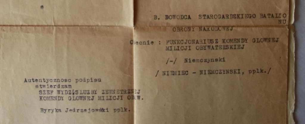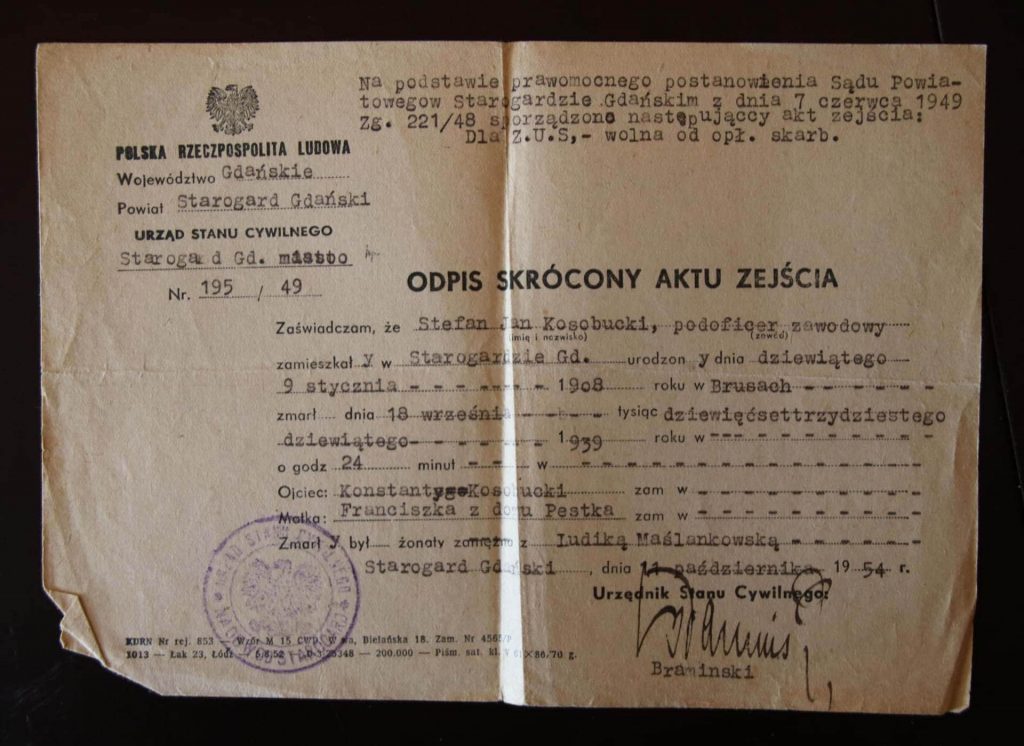 Przeglądam zdjęcia i dokumenty, jakie Jerzy Kosobucki położył na stole. Śliczne zdjęcie ślubne, portretowe z tekstem na odwrotce, zdjęcie ze szpitala, zgoda na ślub, legitymacja, zaświadczenie o śmierci Kosobuckiego (tu już przez “c”), podpisane przez Niemczyńskiego: „Jako były Dowódca Starogardzkiego Batalionu Obrony Narodowej, woj. gdańskie, zaświadczam, że sierż. Kosobucki Stefan był szefem I-szej kompanii starogardzkiego Batalionu Obrony Narodowej i wraz z tym batalionem brał czynny udział w wojnie polsko-niemieckiej od dnia 1. września 1939 r. do dnia 18. września 1939 r.