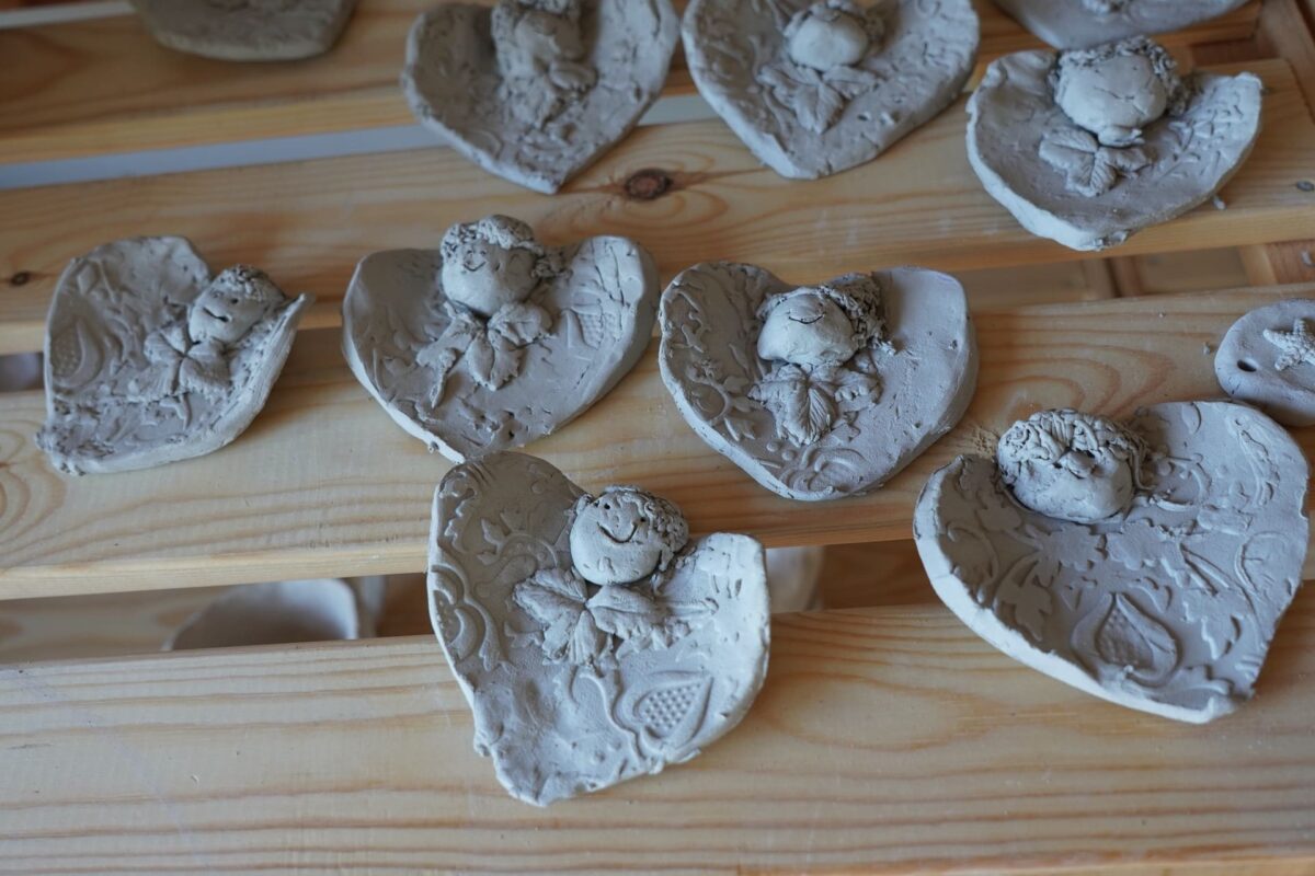Prowadzimy zajęcia dla dzieci, dorosłych, rodzin, grup szkolnych i firm. Uczestnicy lepią ręcznie: aniołki, skrzaty, kubki, liście – wszystko według ustalonego tematu lub własnej wizji . Po wysuszeniu prace trafiają do pieca na wypał, a gotowe wyroby dostarczamy do klienta lub odbiera się je na miejscu.