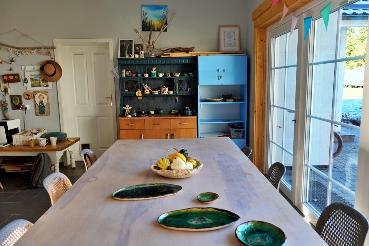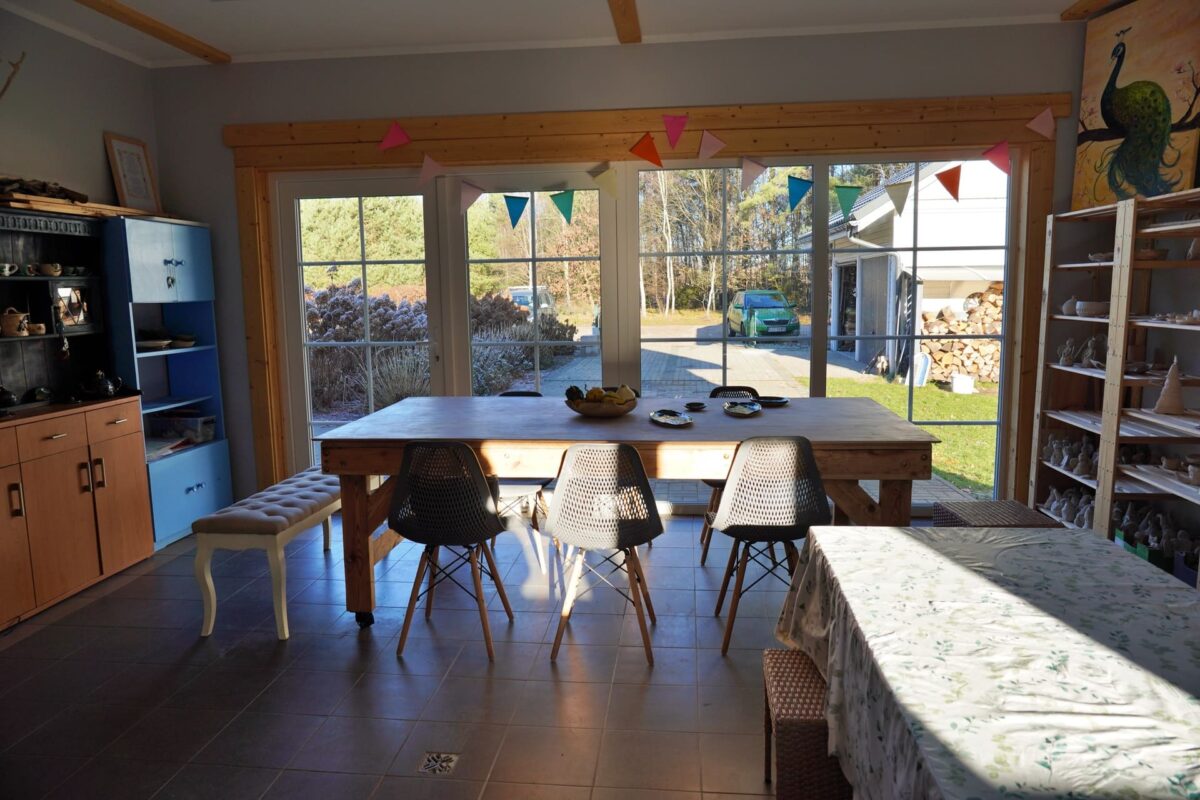 Pracownia stoi tuż przy lesie, około 1,5 km za wsią w idealnym miejscu na twórczy odpoczynek. Dookoła cisza, natura i ścieżki, po których Dorota prowadzi edukacyjne spacery dla dzieci. Po zajęciach można przejść się leśnymi dróżkami, odpalić saunę lub po prostu posiedzieć w ogrodzie i poczuć tę prawdziwą kociewską sielskość. To świetny punkt na mapie „co zobaczyć na Kociewiu”, szczególnie dla osób szukających kreatywnego relaksu.