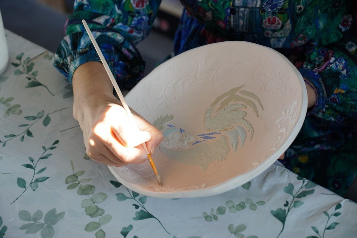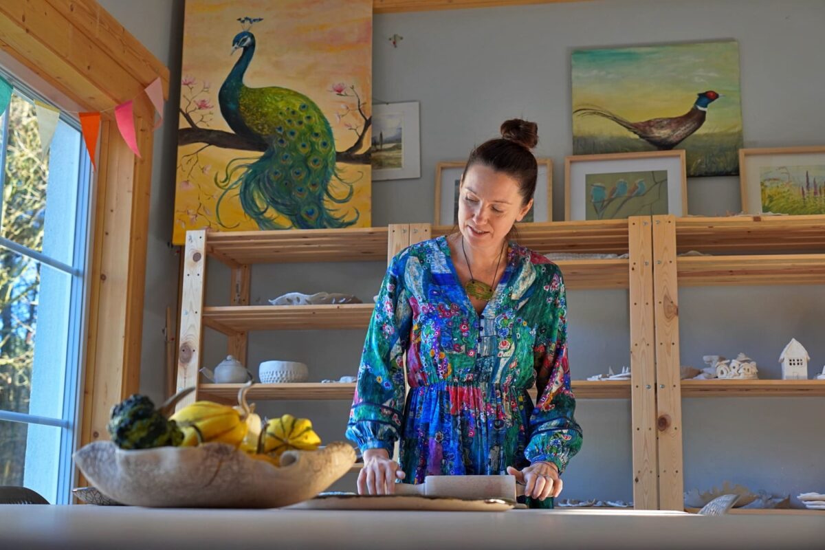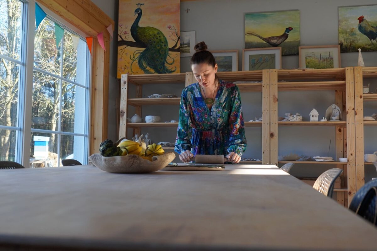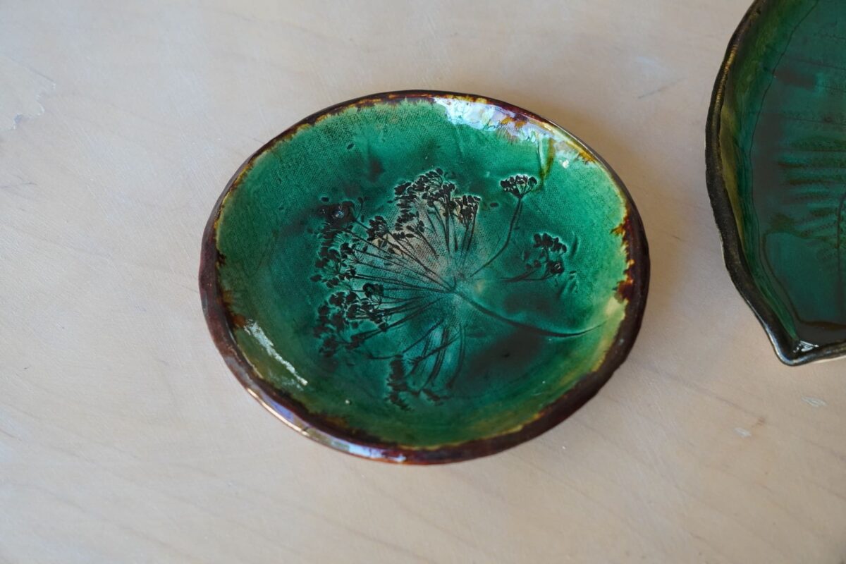 Droga Doroty zaczęła się jeszcze w dzieciństwie – malowała intuicyjnie, traktując to jako formę terapii i sposób na wyciszenie . Prawdziwy zwrot przyszedł w Wielkiej Brytanii, gdzie – zamiast angielskiego – ciągnęło ją do sali ceramicznej art college’u. Po powrocie na Kociewie odkryła ceramikę na nowo dzięki warsztatom u Marka Zagórskiego w Starej Baśni . Dziś prowadzi własną pracownię, a w jej pracach widać to, co kocha najbardziej – przyrodę, liście, faktury, kolory i wiejski klimat, w którym się wychowała.