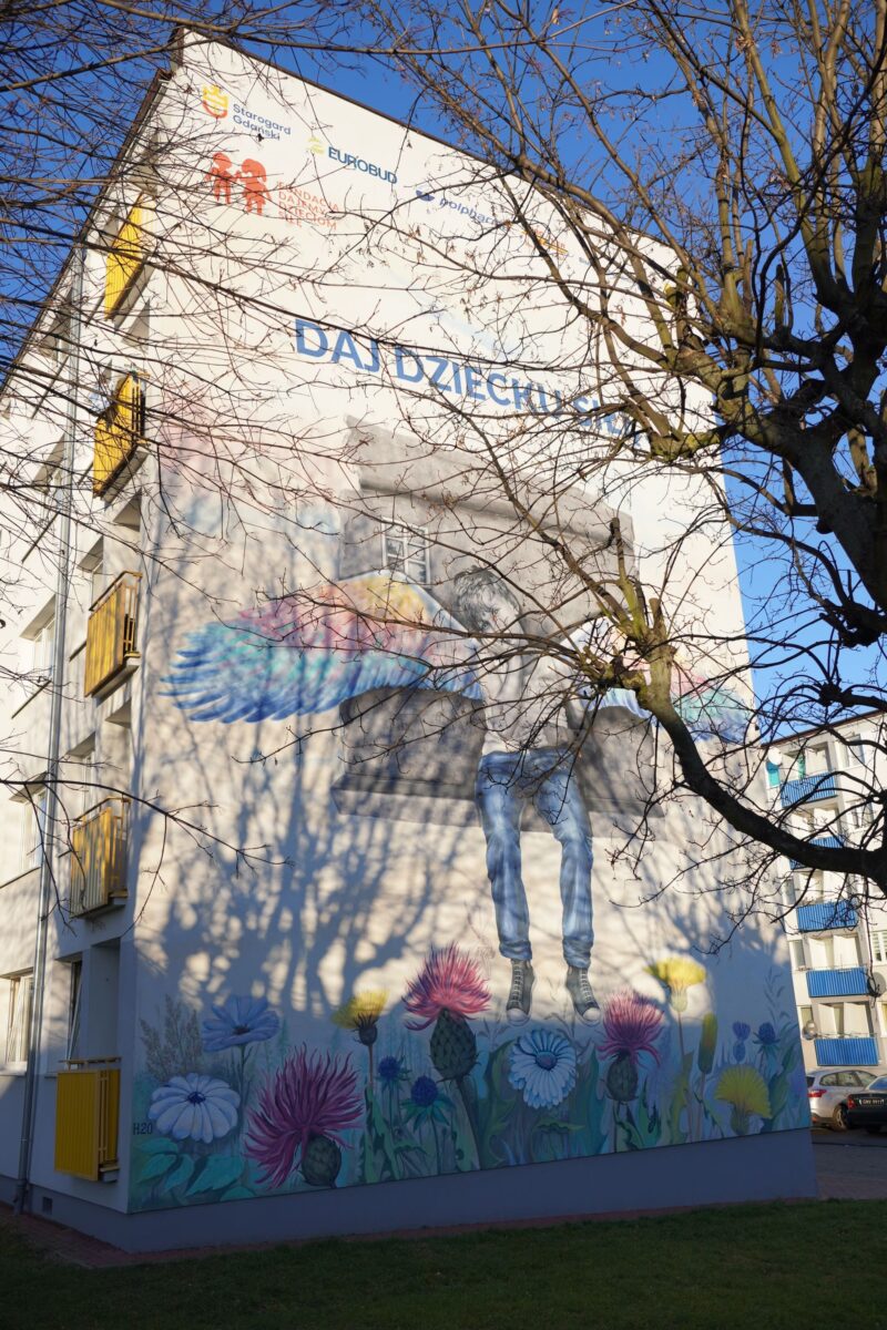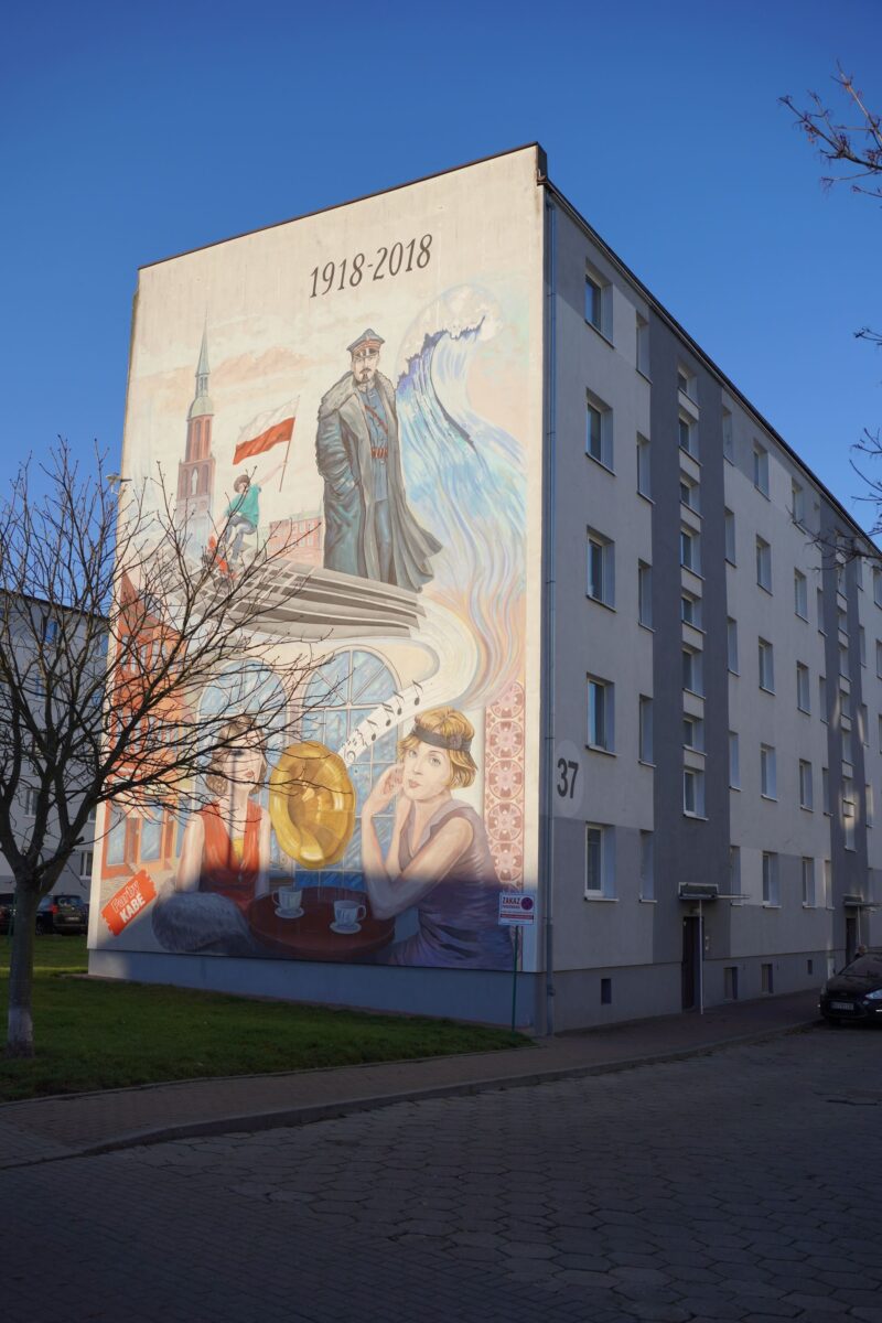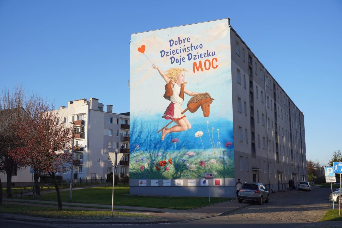 Pierwszy mural (blok nr 35) pojawił się w ramach kampanii Fundacja Dajemy Dzieciom Siłę „Dzieciństwo bez przemocy” — hasło: „Dobre dzieciństwo daje dziecku moc”. Fundacja Dajemy Dzieciom Siłę Kolejne malunki (nr 36 i 37) kontynuują wizję: blok 36 z chłopcem w dżinsach i kolorowymi skrzydłami oraz bogactwem kwiatów kociewskich, blok 37 z kolażem: wieża kościoła św. Katarzyny, żołnierz z datą 1918-2018, chłopiec z flagą Polski, dwie panie z lat 20‐tych przy stoliku w restauracji. Te obrazy łączą lokalną tożsamość, historię miasta i nadzieję na przyszłość.