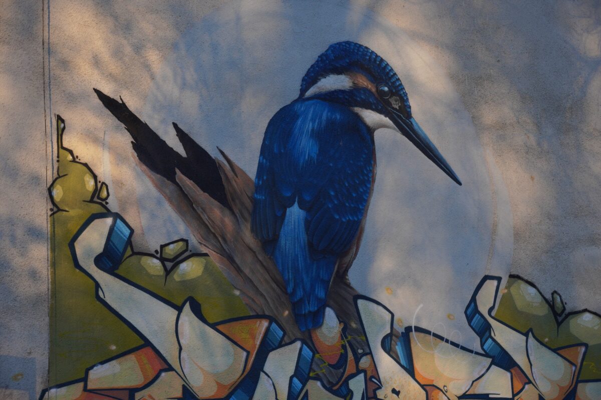 Tuż przy wejściu do parku od strony ulicy Hallera w Starogardzie Gdańskim wita odwiedzających wyjątkowy mural – pełen barw portret zimorodka, jednego z najpiękniejszych ptaków Kociewia. Intensywny błękit, pomarańcze i turkusowe pióra sprawiają, że ściana budynku zamienia się w żywy, pulsujący kolorem fragment nadwodnej natury.