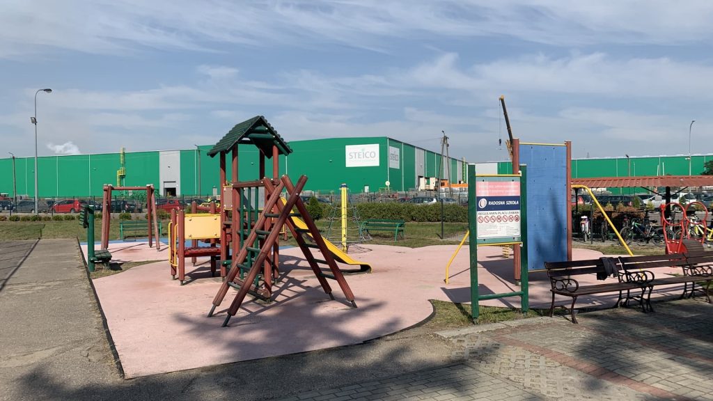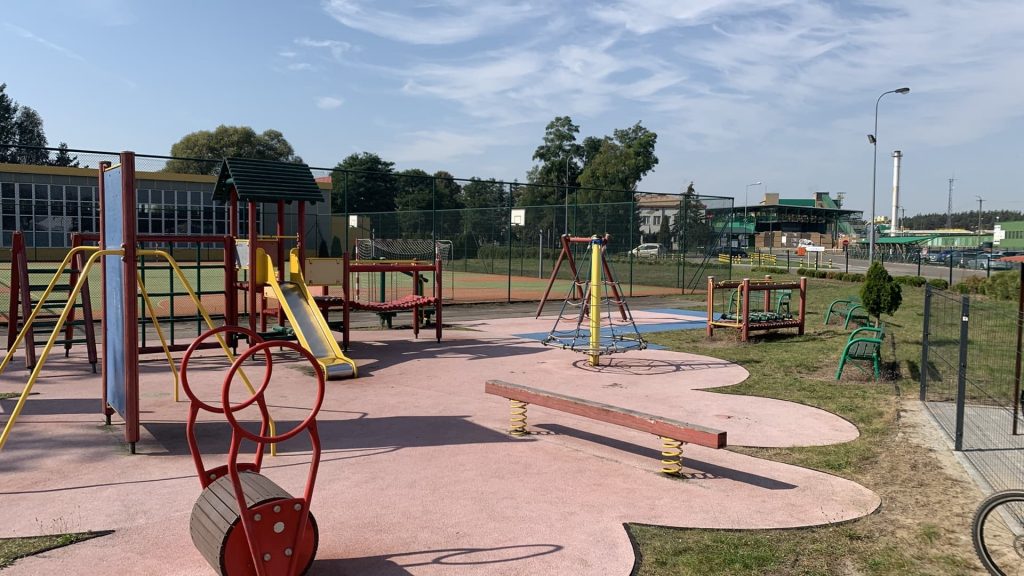Wybudowany między boiskiem wielofunkcyjnym, a wiatą na rowery plac zabaw o powierzchni ok. 240 m2 wyposażony został w nowoczesną nawierzchnię z tworzywa sztucznego oraz urządzenia rekreacyjne: ścianę wspinaczkową, równoważnię, linowe drzewko, ruchomy młynek, zestaw zabawowy ze zjeżdżalnią, huśtawkę pojedynczą, huśtawkę koniczynkę i pomost linowy. Na obrzeżach placu zabaw ulokowane są ławki dla użytkowników.