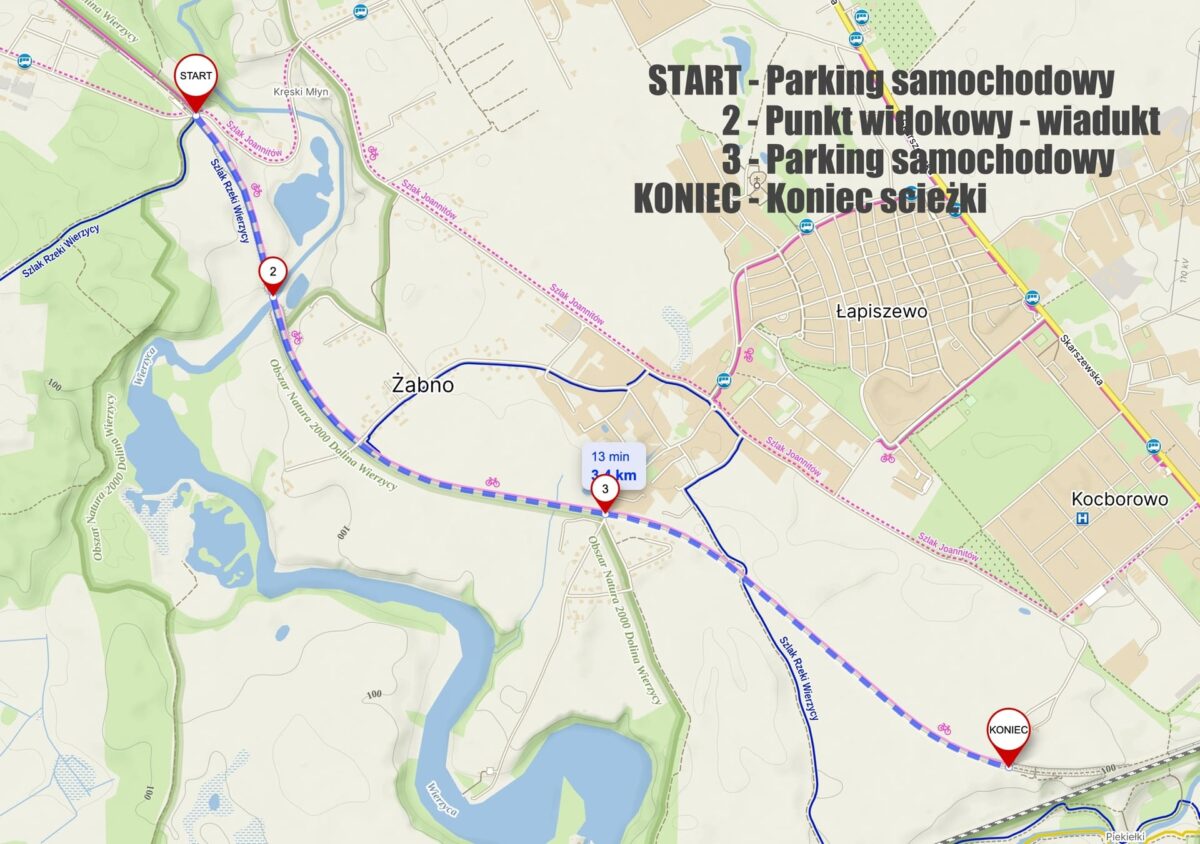 Otoczenie: ścieżka przebiega przez obszar Natura 2000 oraz Obszar Chronionego Krajobrazu Doliny Wierzycy, oferując kontakt z przyrodą i spokojne otoczenie.