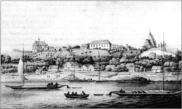 Zachowane skrzydło zamku w Nowem (po prawej) góruje nad Wisłą i panoramą miasteczka.
