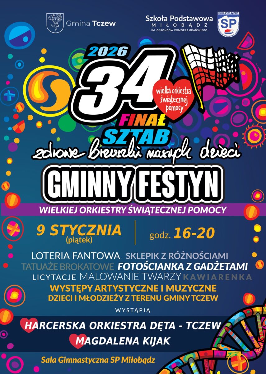 Z uwagi na tegoroczny termin ferii zimowych, 34. Finał WOŚP w Gminie Tczew rozpoczynamy wyjątkowo już w piątek, właśnie od Gminnego Festynu WOŚP w Miłobądzu 🎉