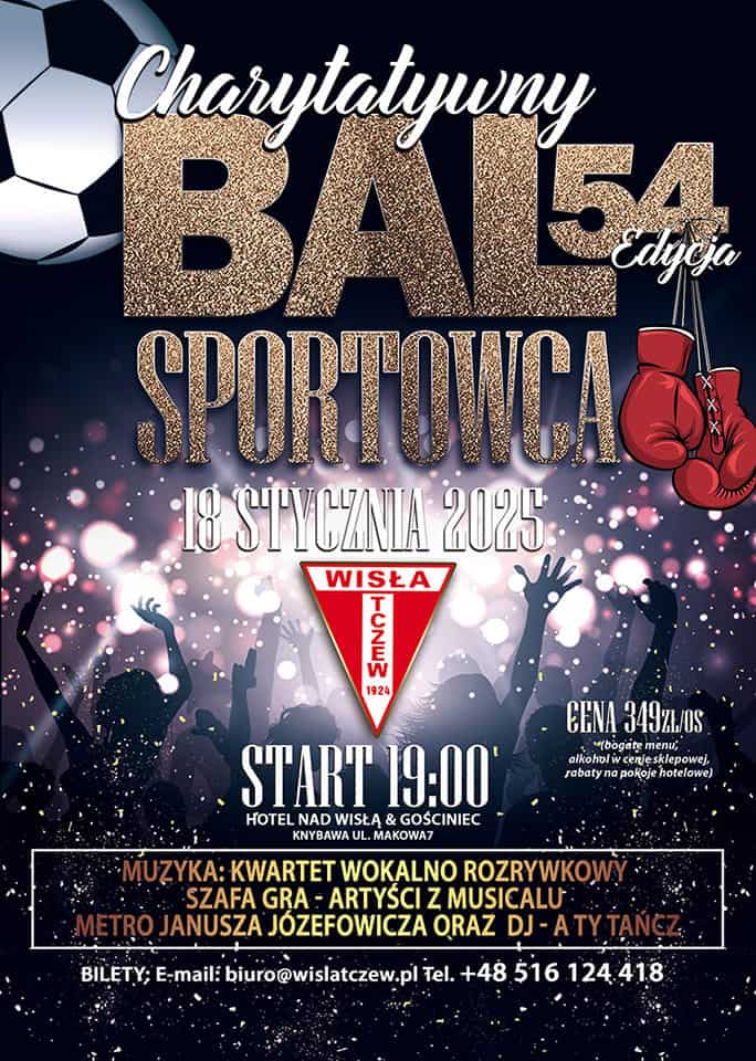 Po raz kolejny wracamy z kultowym Balem Sportowca Wisły Tczew! Tegoroczna, 54. edycja, będzie miała szczególny wymiar charytatywny – całkowity dochód z licytacji zostanie przeznaczony na organizację zimowego obozu sportowego dla Sekcji Bokserskiej Wisły Tczew.