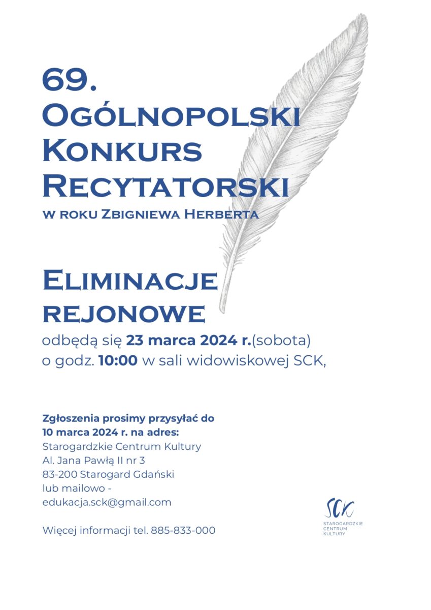 Starogardzkie Centrum Kultury serdecznie zaprasza wszystkich miłośników recytacji do udziału w 69. Ogólnopolskim Konkursie Recytatorskim!