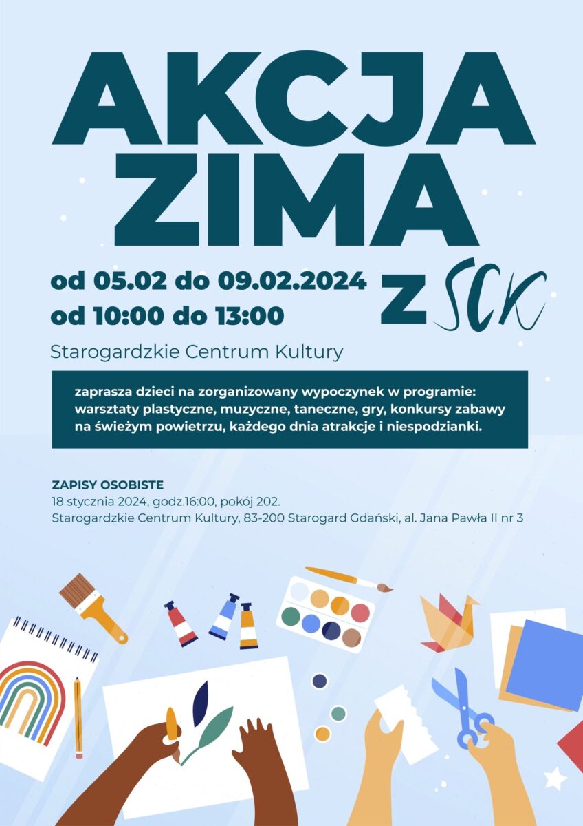 👉 Starogardzkie Centrum Kultury serdecznie zaprasza wszystkie dzieci w wieku od 7️⃣ do 1️⃣2️⃣ lat na niezapomniany ZIMOWY WYPOCZYNEK w ramach #Akcja_Zima_z_SCK! ❄️⛄️