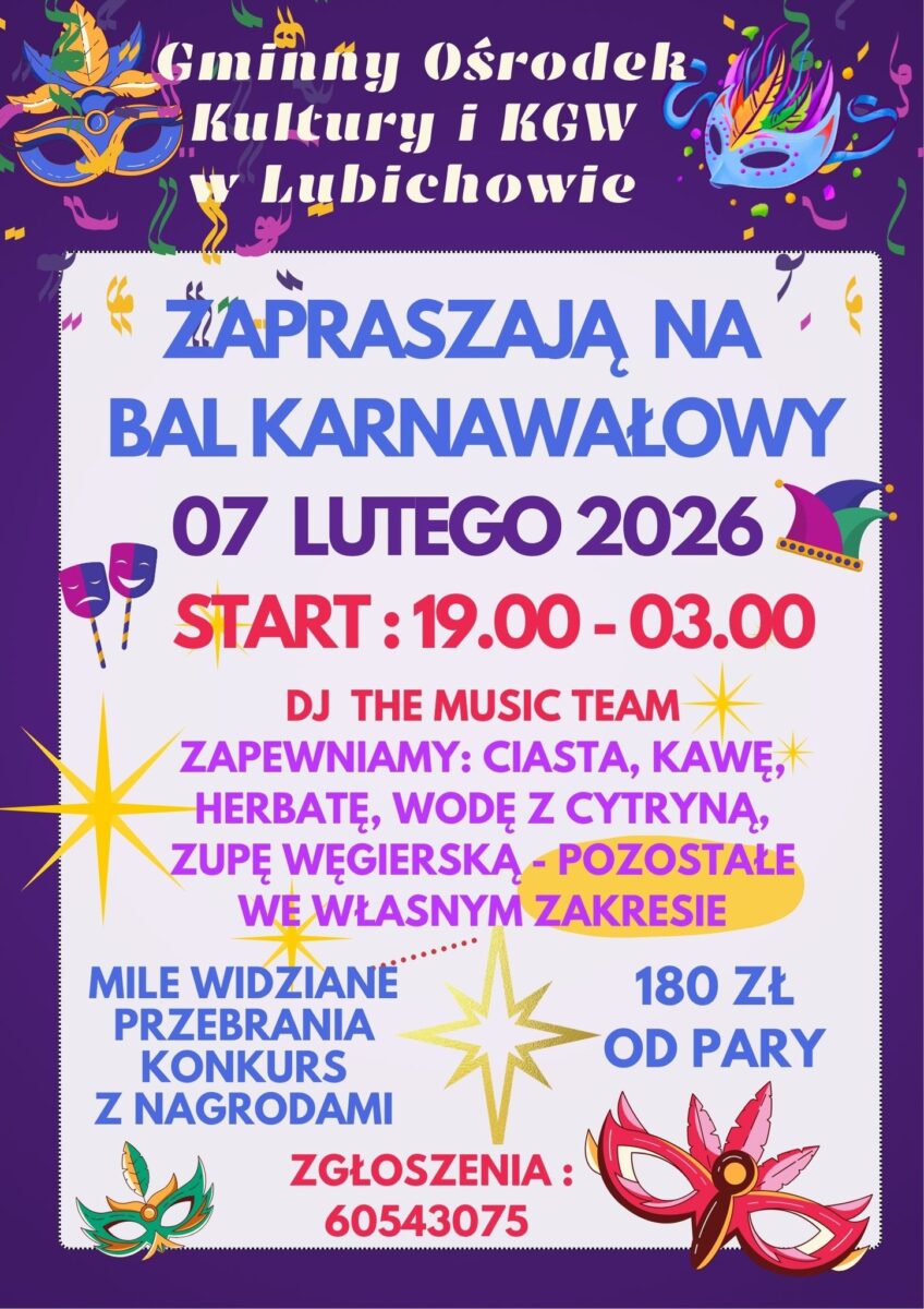 Serdecznie zapraszamy na Zabawę Karnawałową, organizowaną od lat wspólnie z KGW w Lubichowie.
