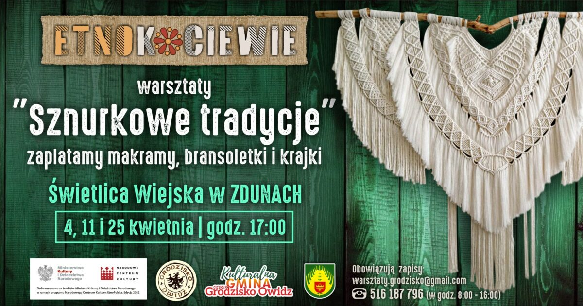 W ramach projektu EtnoKOCIEWIE zapraszamy na „Sznurkowe tradycje” – warsztaty tkackie i plecionkarskie (makrama, krajka, bransoletka)” do świetlicy wiejskiej w ZDUNACH.Spotkania odbędą się w terminach: 4, 11 i 25 kwietnia, o godz. 17:00.