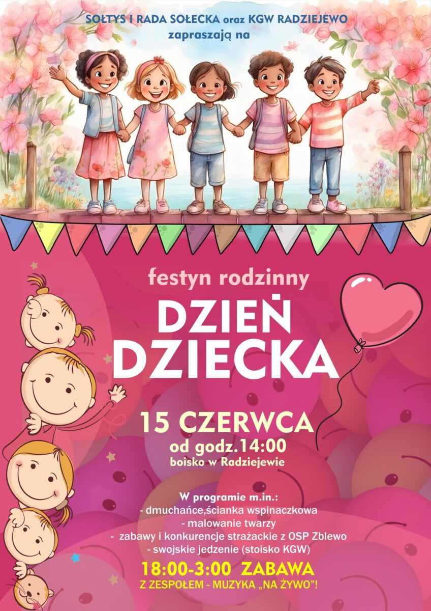 Sołtys i Rada Sołecka oraz KGW Radziejewo serdecznie zapraszają na niezapomniany festyn rodzinny z okazji Dnia Dziecka!