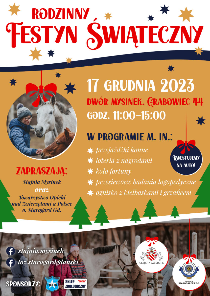 Zapraszamy na Festyn Świąteczny w Stajni Mysinek, podczas którego będziemy zbierać fundusze na zakup samochodu dla Towarzystwa Opieki nad Zwierzętami w Starogardzie Gdańskim. TOZ z powodu awarii dotychczasowego auta ma ograniczone możliwości niesienia pomocy czworonogom, dla tego Państwa pomoc jest tak ważna!