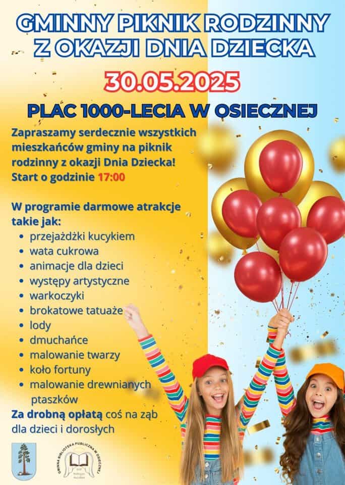 Serdecznie zapraszamy wszystkich mieszkańców gminy na wyjątkowy piknik rodzinny z okazji Dnia Dziecka! Czeka na Was mnóstwo atrakcji – wstęp wolny!