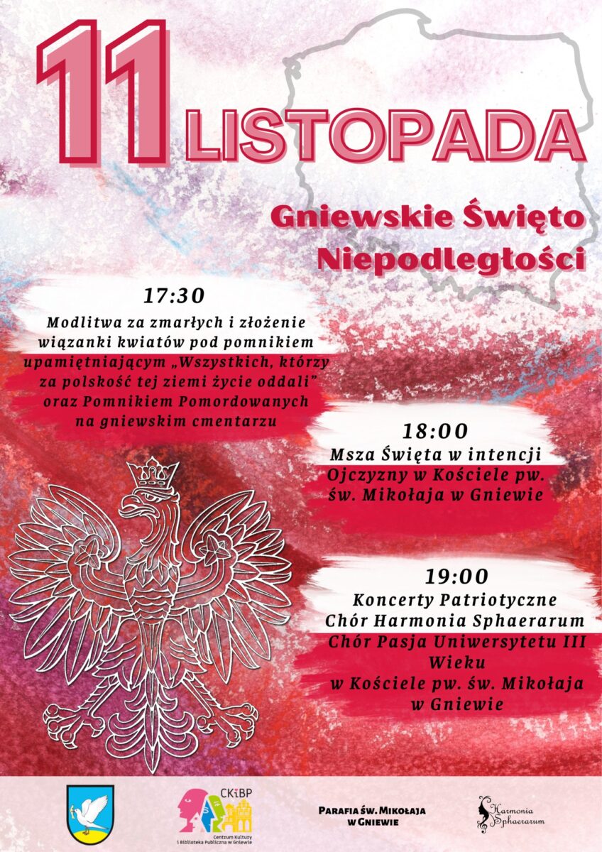 Serdecznie zapraszamy na obchody Święta Niepodległości w Gniewie! To szczególny dzień, w którym uczcimy pamięć bohaterów walczących o wolność Polski, a także wyrazimy naszą dumę narodową.