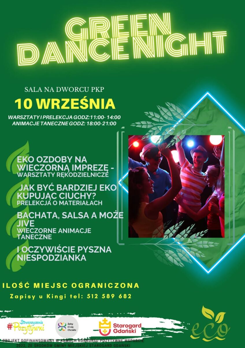 Już 10 września 2022 r. zapraszamy Was na niesamowite, ekologiczno – taneczne wydarzenie! Przygotowaliśmy dla Was rękodzielnicze warsztaty, podczas których razem stworzymy imprezowe dekoracje w stylu eko (w godzinach 11.00-14.00). Natomiast wieczorem wyruszymy w wyjątkową, taneczną podróż (w godzinach: 18.00-21.00). Profesjonalny instruktor nauczy nas podstawowych kroków znanych tańców z całego świata!