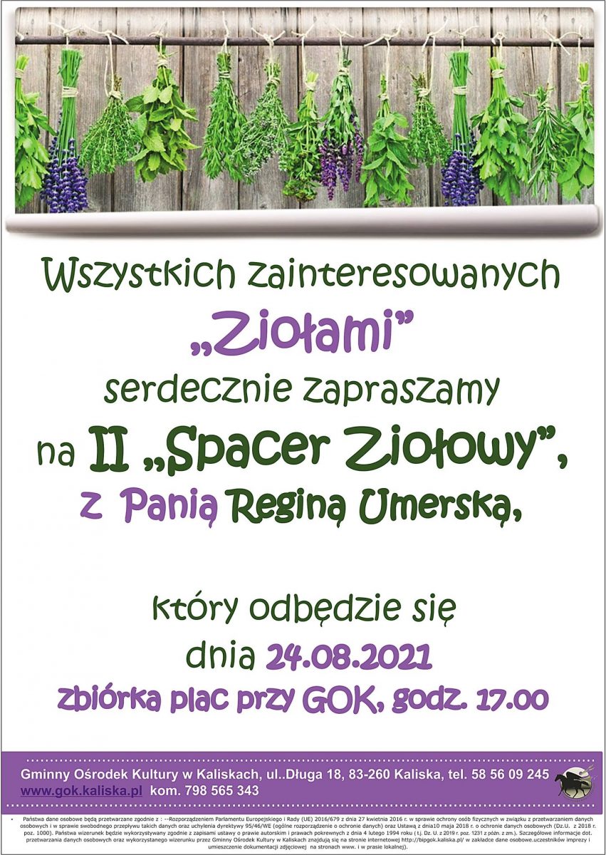 Wszystkich zainteresowanych ziołami serdecznie zapraszamy na II Spacer Ziołowy z Reginą umerską, który odbędzie się 24 sierpnia o godz. 17:00 Zbiórka przy placu GOK Kaliska Więcej informacji wkrótce na naszej stronie internetowej www.gok.kaliska.pl