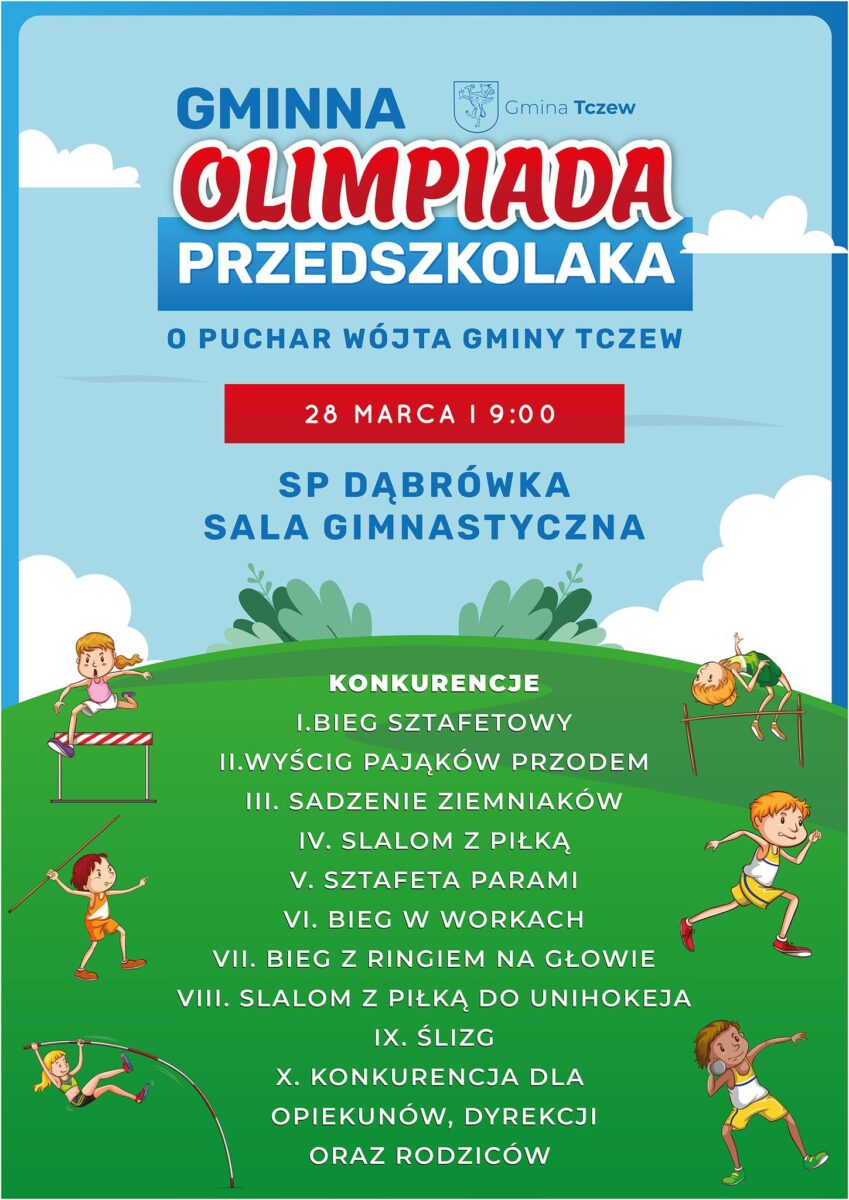 Zapraszamy na sportowe zmagania najmłodszych podczas IV Gminnej Olimpiady Przedszkolaka o Puchar Wójta Gminy Tczew Krzysztofa Augustyniaka. To wydarzenie pełne ruchu, radości i sportowych emocji.