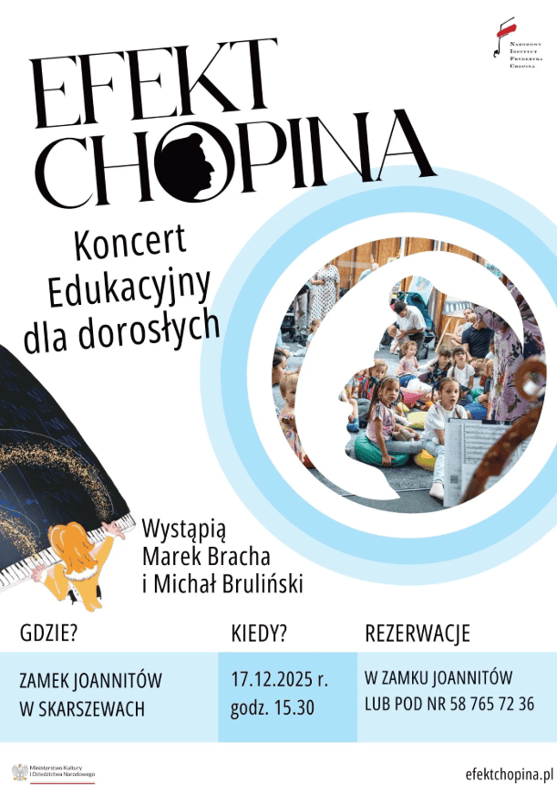 🌟 Nastrojowy koncert, mistrzowie fortepianu, piękne wnętrza zamku i niezwykła opowieść o Chopinie – wszystko w jednym wydarzeniu! Idealne popołudnie dla dorosłych i seniorów.