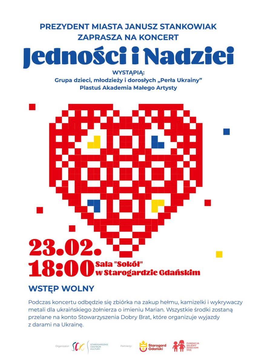 Zapraszamy na drugi Koncert Jedności i Nadziei, organizowany przez Starogardzkie Centrum Kultury! Wydarzenie, które ma na celu prezentację na jednej scenie artystów polskich i ukraińskich, wyrażając w ten sposób nadzieję na pokój na Ukrainie i na całym świecie. 💓 Wstęp wolny.