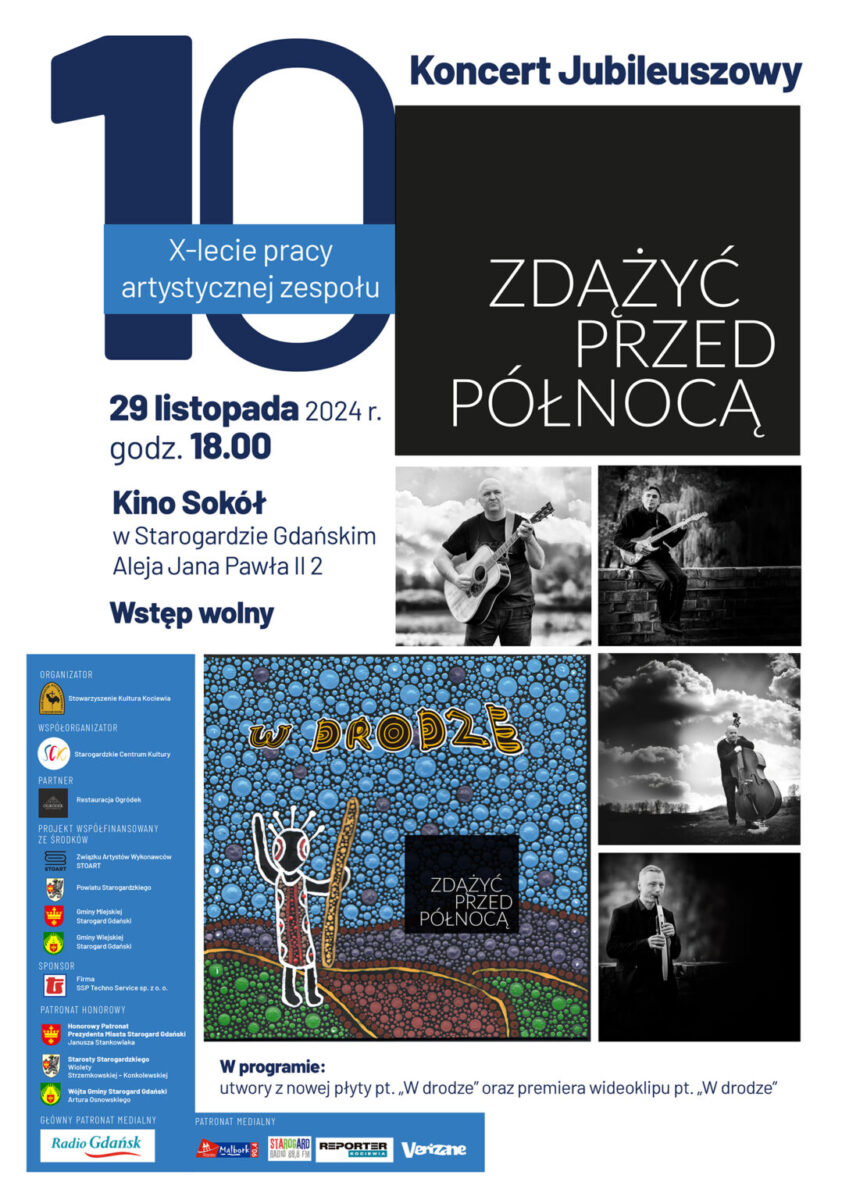 Zapraszamy na wyjątkowy jubileuszowy koncert zespołu „Zdążyć przed Północą”, który od 2014 roku cieszy słuchaczy poetycką muzyką o bluesowo-folkowym brzmieniu. Z okazji dziesięciolecia działalności, zespół zaprezentuje utwory z najnowszego albumu „W drodze” oraz premierowo wyświetli wideoklip promujący tytułowy utwór z płyty.