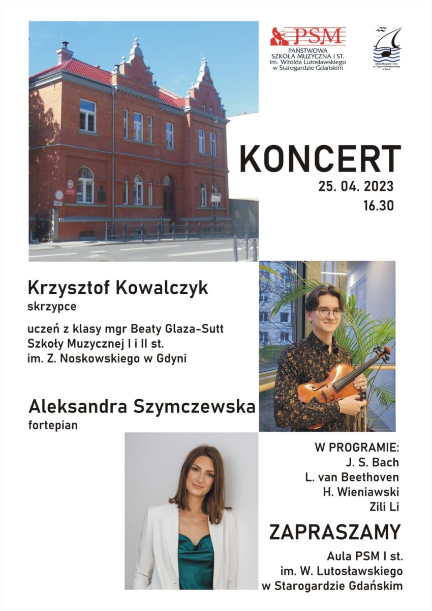 Zapraszamy wszystkich miłośników muzyki na wyjątkowy koncert, który odbędzie się 25 kwietnia o godzinie 16:30 w Państwowej Szkole Muzycznej w Starogardzie Gdańskim.