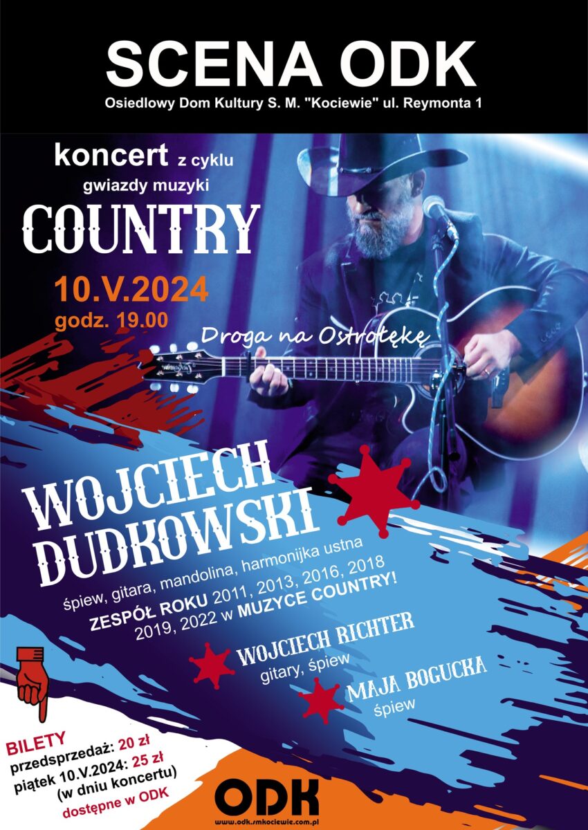 OSIEDLOWY DOM KULTURY wraz z panem ZBIGNIEWEM DOMACHOWSKIM oraz PRZYJACIELAMI SCENY ODK serdecznie zapraszają na koncert z cyklu GWIAZDY MUZYKI COUNTRY, który odbędzie się 10 maja 2024 roku o godzinie 19:00 na SCENIE ODK przy ul. Reymonta 1 w Starogardzie Gdańskim.