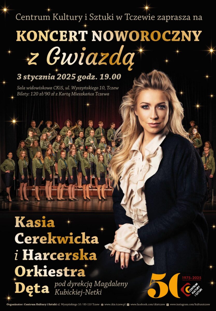 🌟 Z wielką radością zapraszamy na Koncert Noworoczny z Gwiazdą, który jednocześnie zainauguruje obchody 50-lecia CKiS! W tym roku mamy dla Was wyjątkowy duet: Kasia Cerekwicka, jedna z najbardziej cenionych polskich wokalistek, oraz Harcerska Orkiestra Dęta im. Stanisława Moniuszki, zespół o bogatej tradycji i wyjątkowym dorobku artystycznym.