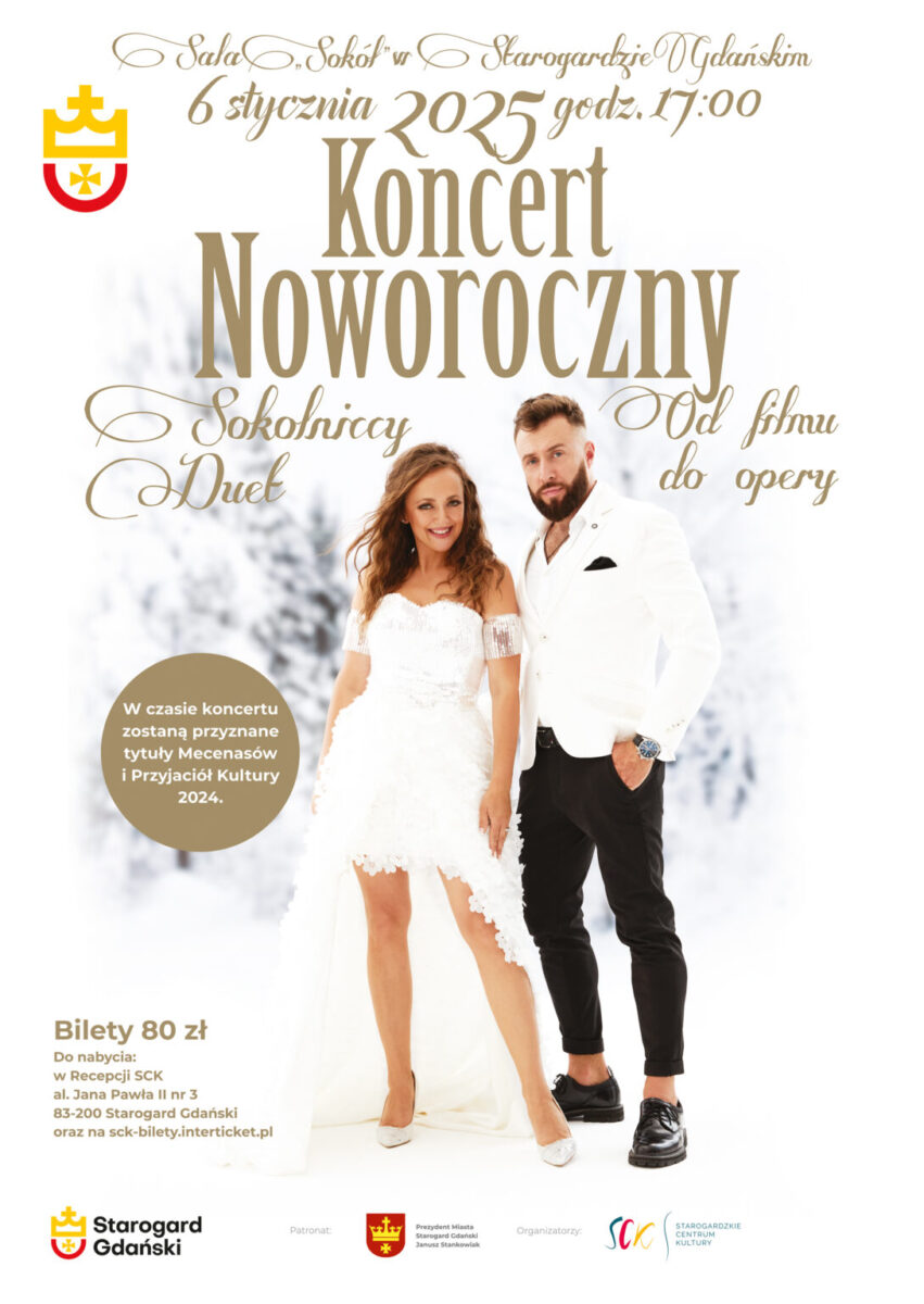 Starogardzkie Centrum Kultury serdecznie zaprasza na uroczysty Koncert Noworoczny, podczas którego będziemy mogli podziwiać występ znakomitego duetu wokalnego Sokolniccy Duet – Agnieszki Sokolnickiej (sopran) oraz Woytka Soko Sokolnickiego (tenor). To muzyczne wydarzenie jest doskonałą okazją, aby przywitać Nowy Rok w rytmach pięknych arii operowych i przebojów filmowych.