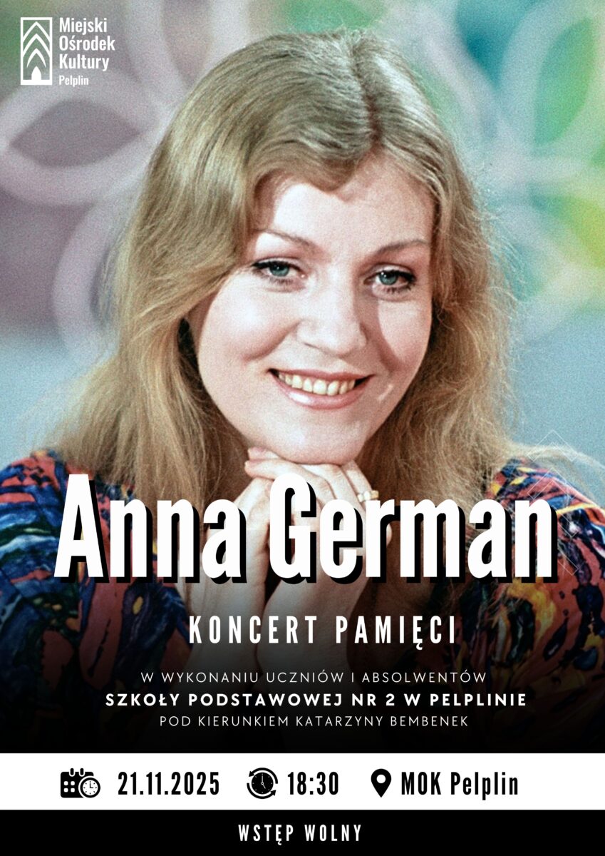 Podczas koncertu usłyszymy interpretacje utworów Anny German w wykonaniu uczniów i absolwentów Szkoły Podstawowej nr 2 w Pelplinie.