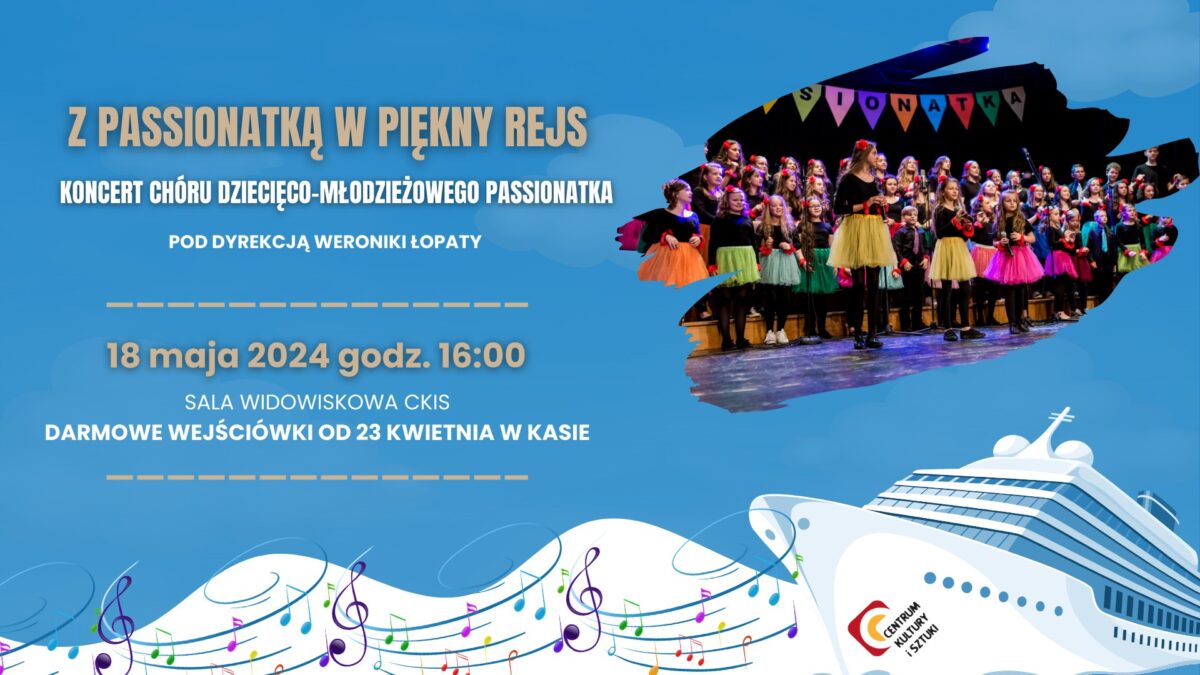 Z Passionatką w piękny rejs to wydarzenie podsumowujące roczną pracę Chóru Dziecięco-Młodzieżowego Passionatka. Podczas koncertu przeniesiemy się w różne części muzycznego świata, aby razem odkrywać, co łączy wszystkich ludzi, mimo dzielących ich mórz i oceanów. 🎵🚢