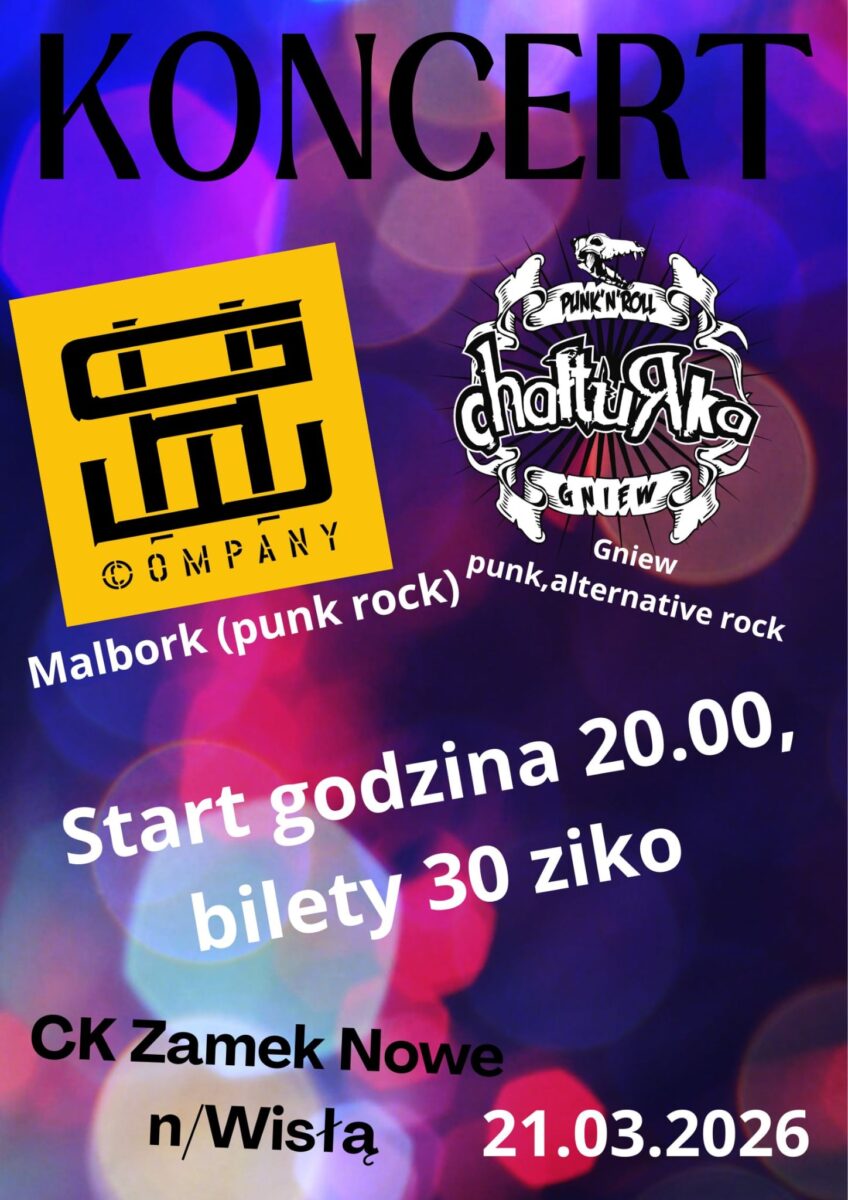Wiosnę w Nowem nad Wisłą powitamy w rockowym klimacie. Na scenie pojawią się zespoły Chałturrrrka oraz HGW Company. Zapowiada się wieczór pełen mocnego brzmienia i koncertowej energii.
