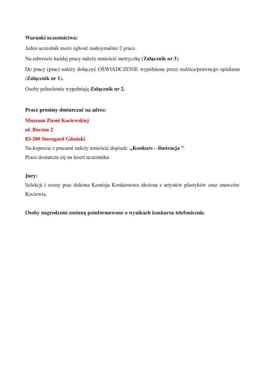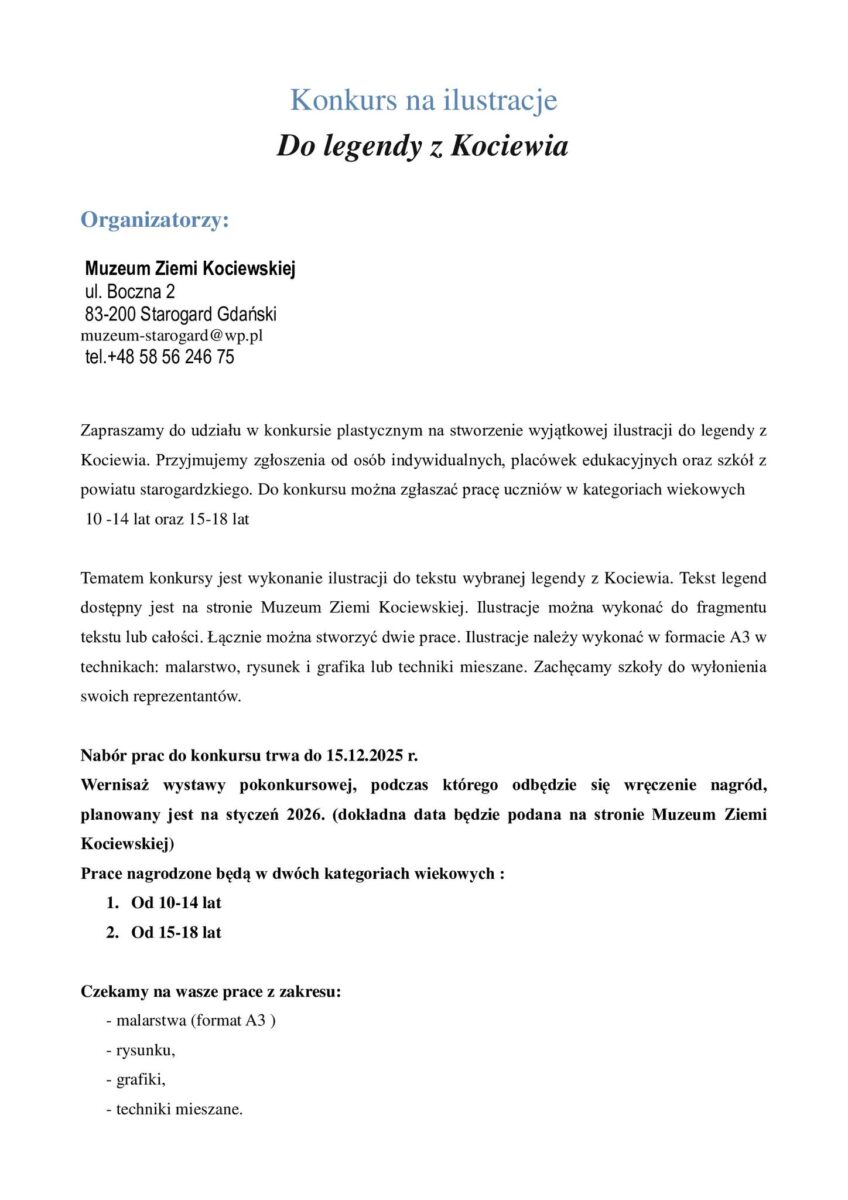 Najlepsze prace zostaną nagrodzone w dwóch kategoriach wiekowych oraz zaprezentowane na wystawie w Muzeum Ziemi Kociewskiej.