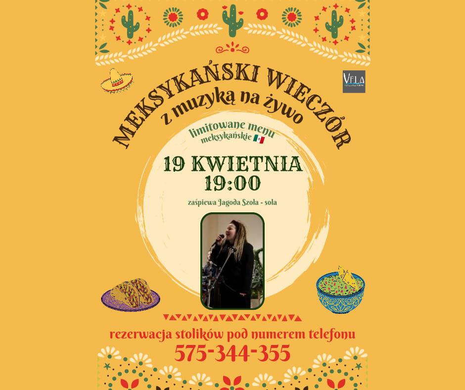 Dołączcie do nas 19 kwietnia o 19:00 na niezapomnianą noc pełną meksykańskich dźwięków i smaków! Pragniemy serdecznie zaprosić Was na wyjątkowy wieczór muzyczny w rytmach meksykańskich, hiszpańskich-latino i nie tylko, który poprowadzi utalentowana Jagoda Szoła, znana jako “sola”.