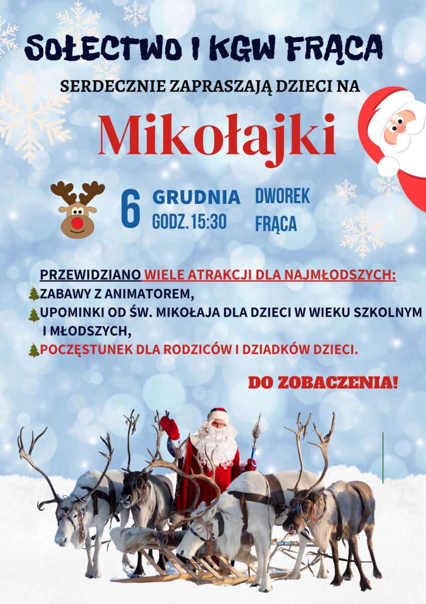 Dzieci z sołectwa Frąca, czy wiecie już, że w Mikołajki czeka Was świetna zabawa z animatorką i upominki od Świętego