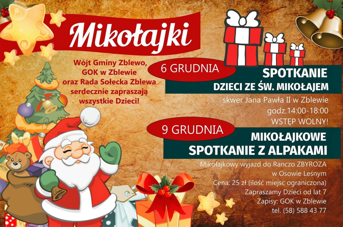 Wójt Gminy Zblewo, GOK w Zblewie oraz Rada Sołecka Zblewa serdecznie zapraszają wszystkie Dzieci na spotkanie ze św.Mikołajem. Będzie świąteczna atmosfera, słodkie upominki i dużo dobrej zabawy.