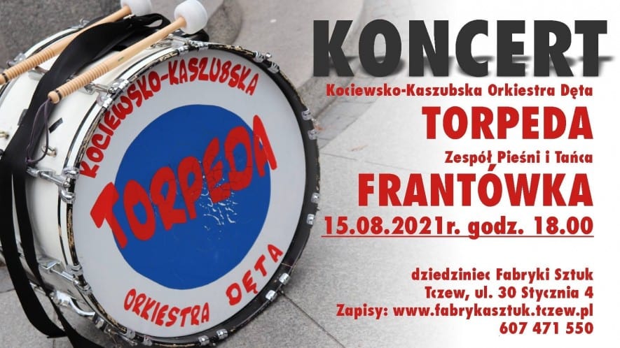 15 sierpnia o godz. 18.00 wystąpi Kociewsko-Kaszubska Orkiestra Dęta TORPEDA oraz Zespół Pieśni i Tańca Frantówka. W ich wykonaniu usłyszymy polskie pieśni wojskowe i piosenki powstańcze. Wstęp bezpłatny, ale obowiązują wcześniejsze zapisy: www.fabrykasztuk.tczew.pl lub tel. 607 471 550.