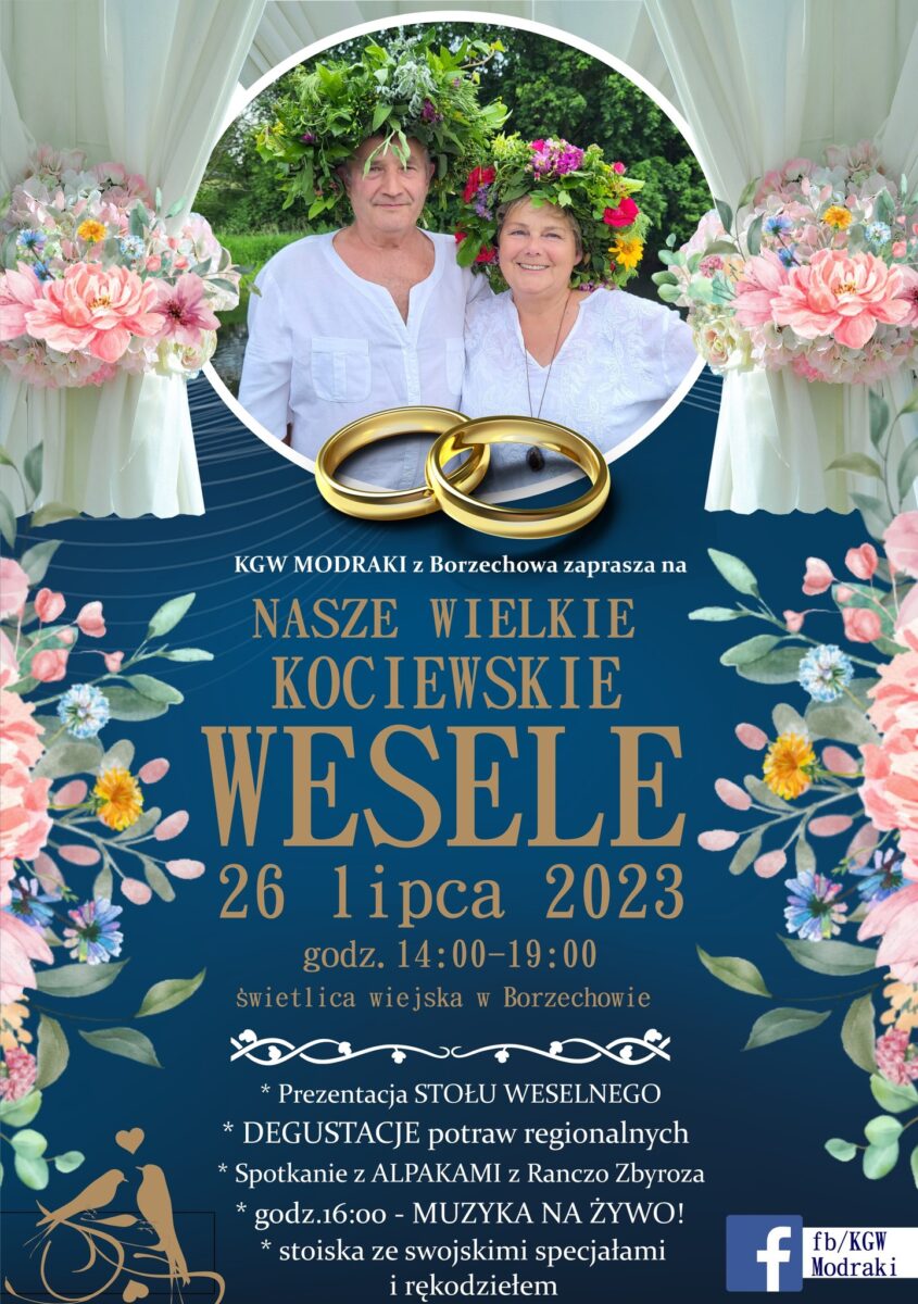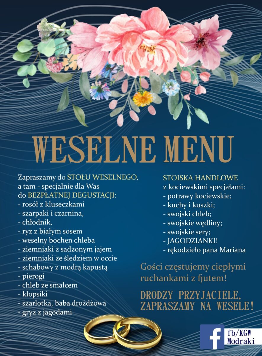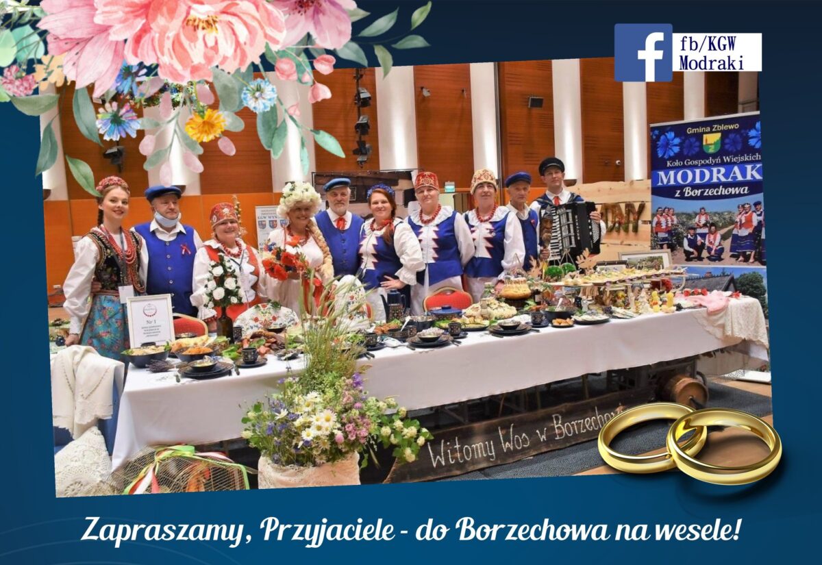 Elżbieta Piórkowska – przewodnicząca borzechowskiego KGW – w imieniu Modraczków zaprasza Was wszystkich! Niech to będzie wyjątkowy dzień! A jeśli macie strój kociewski – ubierzcie go, prosimy.I przybywajcie Przyjaciele do Borzechowa na wesele! Wstęp wolny. A co dla Was mamy? Stół weselny uginający się od kociewskich przysmaków – do bezpłatnej degustacji (menu znajdziecie na grafice). Oprócz tego – stoiska handlowe, na których kupicie prawdziwe kociewskie delicyje, przygotowane przez nasze Modraki i ich Przyjaciół! Czyli m.in. swojski chleb, przetwory, sery, wędliny, dania i potrawy na wynos ![]()