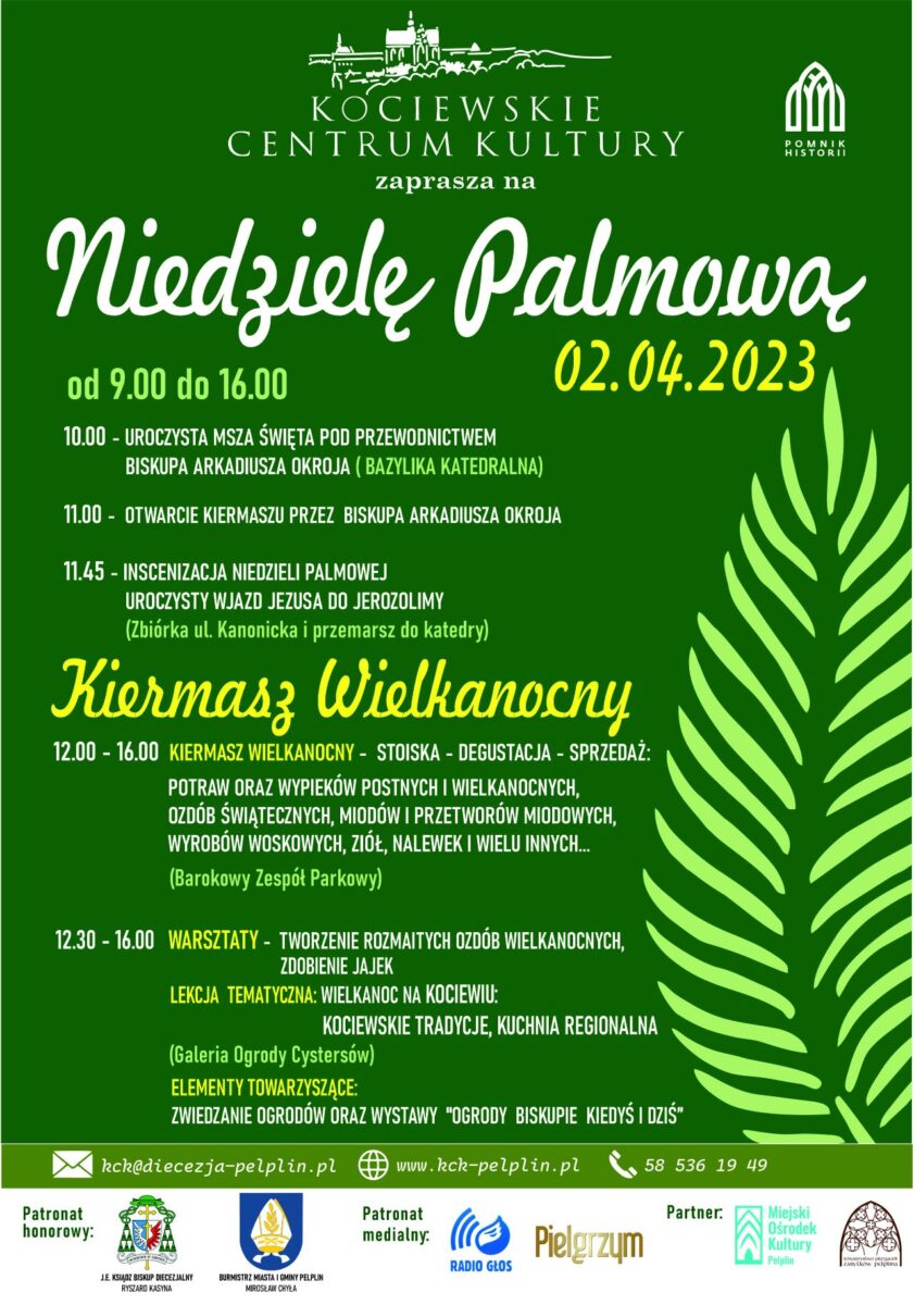 Kociewskie Centrum Kultury serdecznie zaprasza na Niedzielę Palmową i Kiermasz Wielkanocny 2 kwietnia 2023 roku w godzinach od 9.00 do 16.00. Obchody Niedzieli Palmowej rozpocznie uroczysta Msza Święta o godzinie 10.00 w Bazylice Katedralnej w Pelplinie.