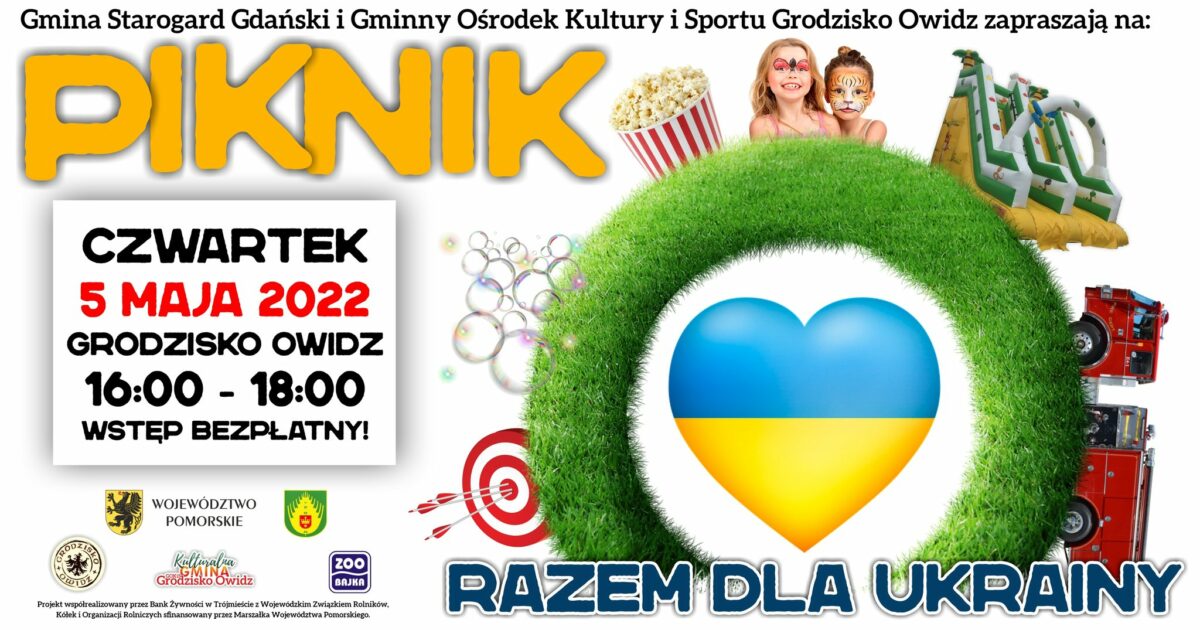 Gmina Starogard Gdański i Gminny Ośrodek Kultury i Sportu Grodzisko Owidz zapraszają serdecznie w czwartek, 5 maja, w godzinach 16:00 – 18:00 na piknik “Razem dla Ukrainy”.