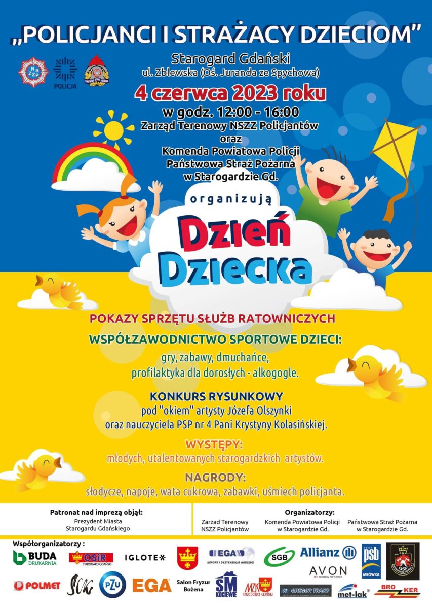 4 czerwca 2023 roku w godzinach 12:00 – 16:00 Zarząd Terenowy NSZZ Policjantów, Komenda Powiatowa Policji oraz Państwowa Straż Pożarna w Starogardzie Gdańskim organizują #DZIEŃ#DZIECKA
