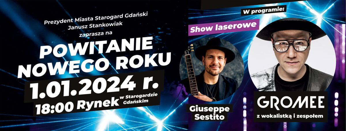 Na Rynku w Starogardzie Gdańskim od godziny 18:00 koncert Giuseppe Sestito i specjalny pokaz laserowy. Życzenia noworoczne mieszkańcom złożą władze miasta. Przeboje do tańca zaprezentuje GROMEE – jeden z najpopularniejszych polskich DJ-ów ![]()