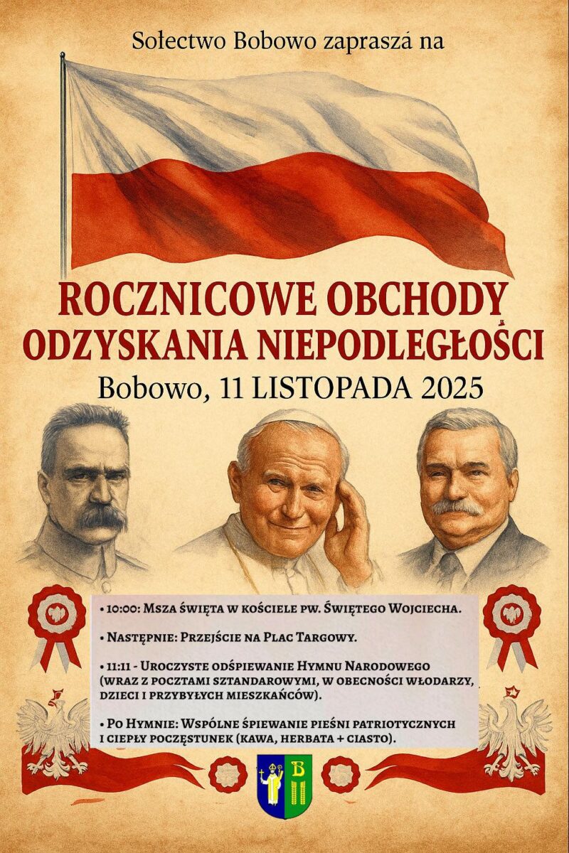 Sołectwo Bobowo serdecznie zaprasza wszystkich mieszkańców na wspólne świętowanie jednego z najważniejszych dni w historii Polski – Narodowego Święta Niepodległości.