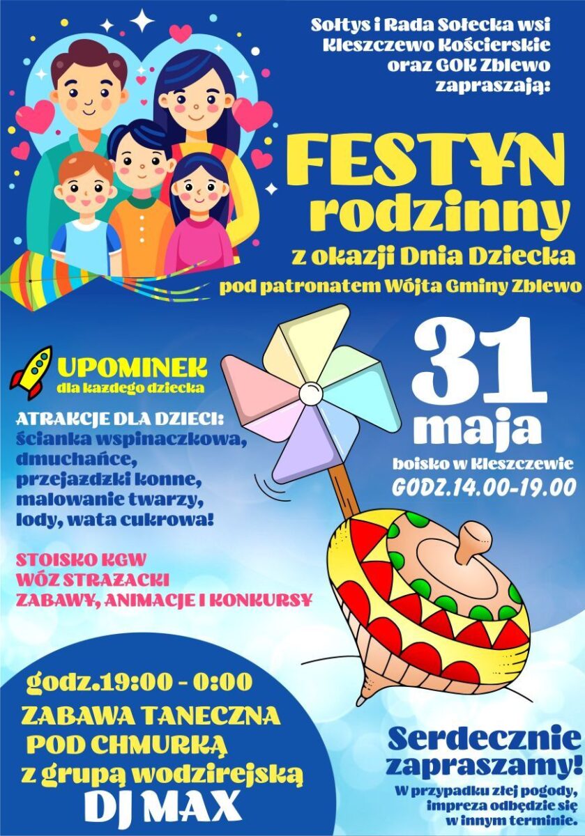 Sołtys i Rada Sołecka wsi Kleszczewo Kościerskie oraz GOK Zblewo zapraszają wszystkie dzieci, rodziców i mieszkańców na wyjątkowe świętowanie Dnia Dziecka – pod patronatem Wójta Gminy Zblewo!