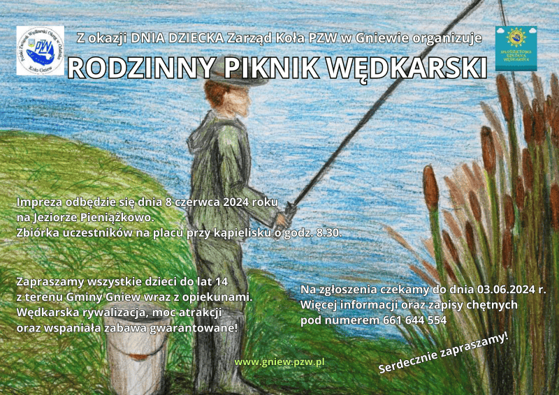Zarząd Koła PZW w Gniewie serdecznie zaprasza wszystkie dzieci do lat 14 z terenu Gminy Gniew wraz z opiekunami na Rodzinny Piknik Wędkarski z okazji Dnia Dziecka!