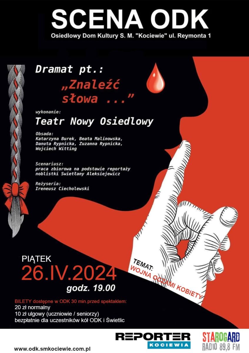 TEATR NOWY OSIEDLOWY & SCENA ODK serdecznie zapraszają na dramat na podstawie reportaży Swietłany Aleksiejewicz “pt.: Znaleźć słowa…”