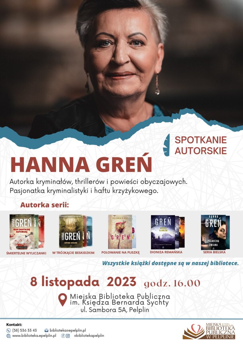𝟖 𝐥𝐢𝐬𝐭𝐨𝐩𝐚𝐝𝐚 𝐨 𝐠𝐨𝐝𝐳. 𝟏𝟔.𝟎𝟎 w Miejskiej Bibliotece Publicznej im. Księdza Bernarda Sychty w Pelplinie📖 odbędzie się spotkanie z autorką kryminałów, thrillerów i powieści obyczajowych – Hanna Greń – strona autorska🖊