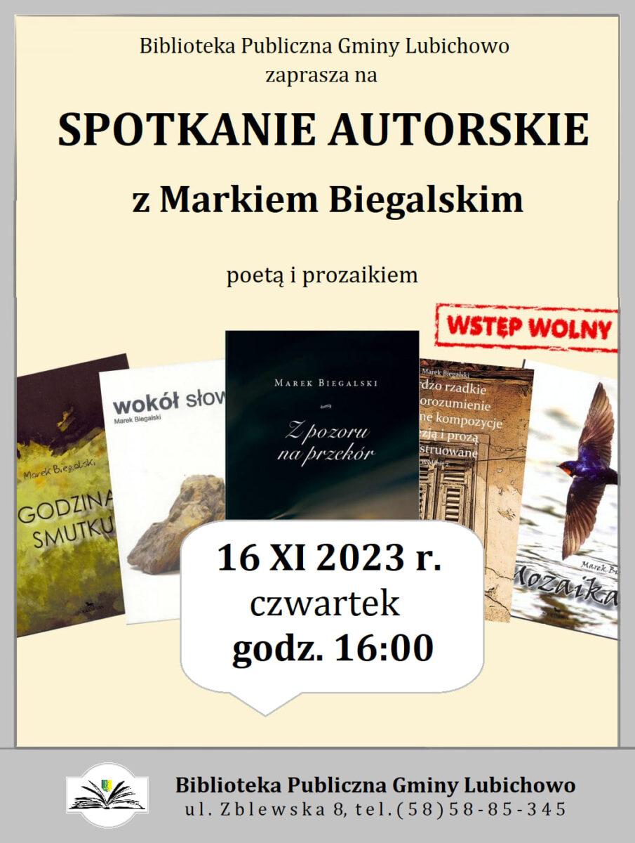 Serdecznie zapraszamy wszystkich zainteresowanych na SPOTKANIE AUTORSKIE Z MARKIEM BIEGALSKIM – poetą i prozaikiem, starogardzianinem. Wydarzenie odbędzie się w czwartek, 16 listopada br. o godz. 16⁰⁰ w naszej lubichowskiej bibliotece. Wstęp wolny.