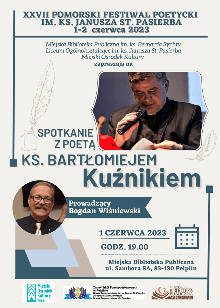 1 czerwca 2023 r. o godz. 19.00 w Bibliotece Miejskiej w Pelplinie odbędzie się spotkanie z poetą ks. Bartłomiejem Kuźnikiem. Spotkanie, które odbywa się w ramach XXVII Pomorskiego Festiwalu Poetyckiego im. ks. Janusza St. Pasierba, poprowadzi Bogdan Wiśniewski.